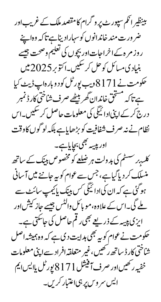 The Benazir Income Support Programme (BISP) has always been a lifeline for poor and deserving families in Pakistan. In an environment where rising inflation and unemployment continue to make survival harder, this program helps millions of households cover basic expenses such as food, education, and healthcare. To make the process more transparent and easier, the government introduced a re-update of the 8171 web portal in October 2025.