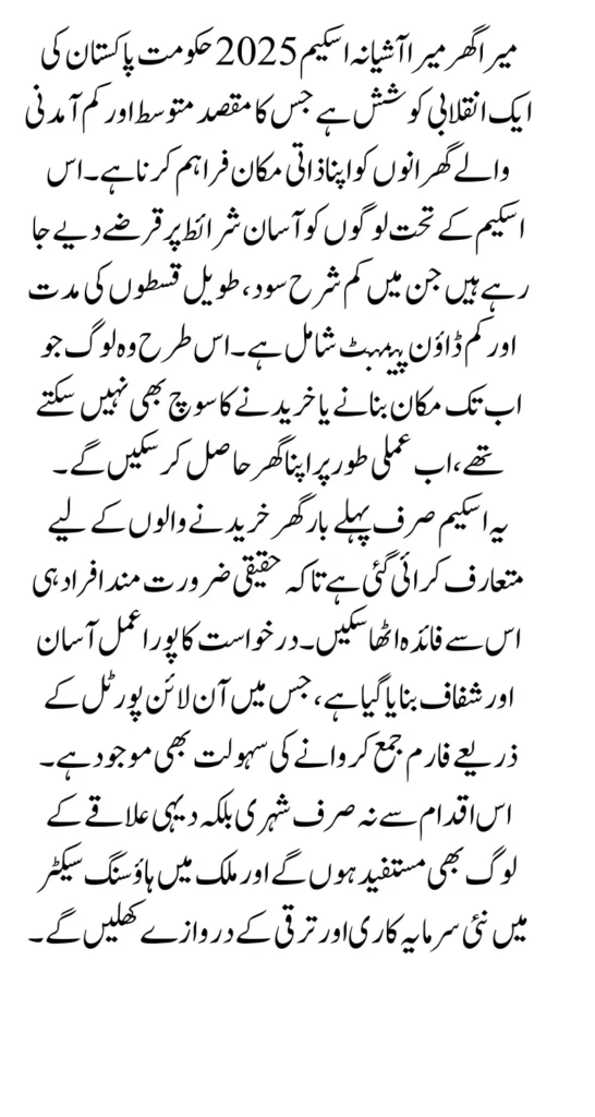 Mera Ghar Mera Ashiana Scheme Owning a home is the biggest dream of every family, but for many low and middle-income households in Pakistan, this dream always feels out of reach. The Government of Pakistan, in collaboration with the State Bank of Pakistan (SBP), has launched the Mera Ghar Mera Ashiana Scheme 2025 to make this dream possible. This housing finance scheme offers affordable loans with low markup, small down payments, and long repayment options, ensuring that even those with limited income can buy or build their first home.